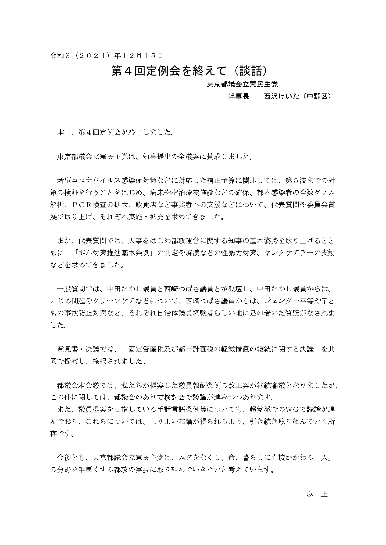 | 2021.08.20 | 都議会臨時会を終えて(談話) |
